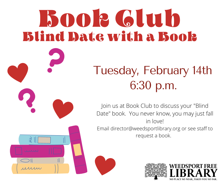 Book Club- Blind Date with a Book Tuesday, February 14, 2023 6:30 PM 7:30 PM 18:30 19:30 Weedsport Free Library 2795 East Brutus Street Weedsport, NY 13166 U.S. (map) Google Calendar ICS