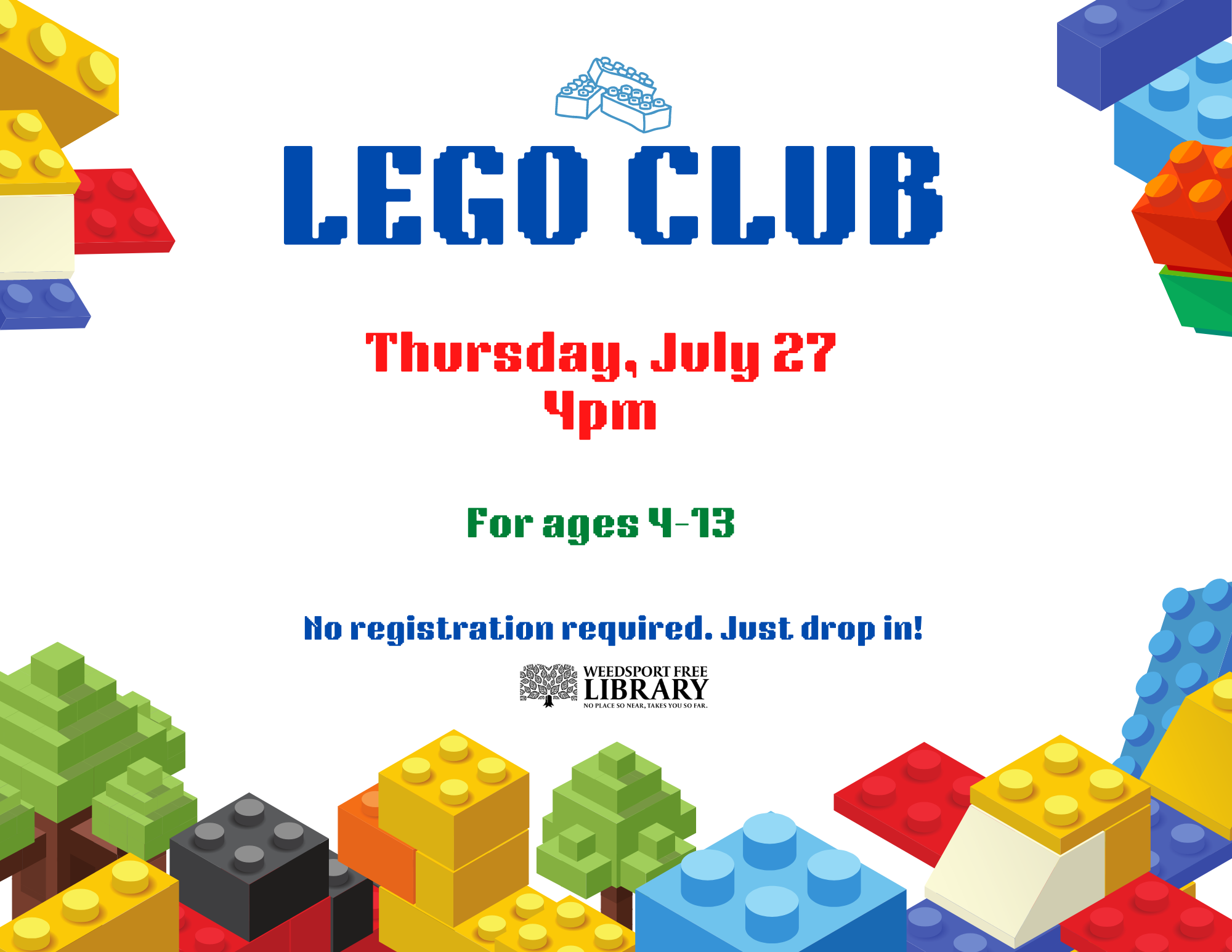 Lego Club will be held on Thursday, July 27th at 4:00pm. This program is geared to kids 4-13 years old. Legos are supplied. Come and be creative! Enjoy the library air conditioning as you build! Lego creations will be displayed in the library for 2 weeks. No registration needed.